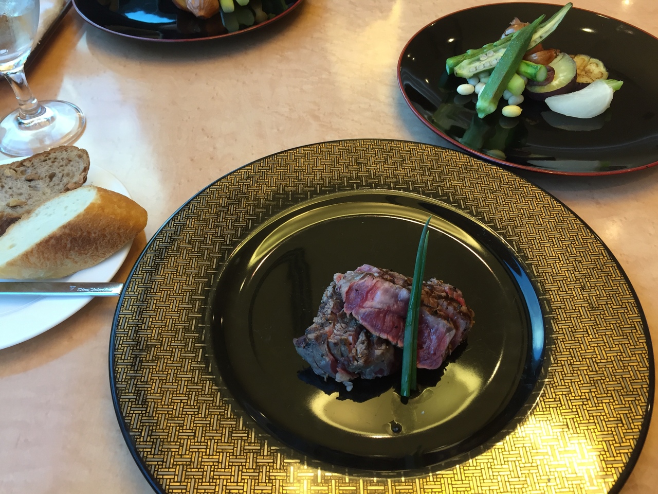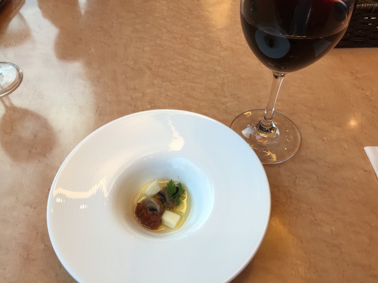 十勝ガーデンズホテルの二階にあるレストランで、オススメのディナーを頂きました。プチ前菜はチーズ、マッシュルームとドライトマトのオリーブオイル漬け。温野菜のサラダ、ゴボウのポタージュ、メインはフィレステーキ、デザート、コーヒー。3,800円はコスパ良好。スペイン赤ワイン、ビーノティントクリアンサが良くあう。