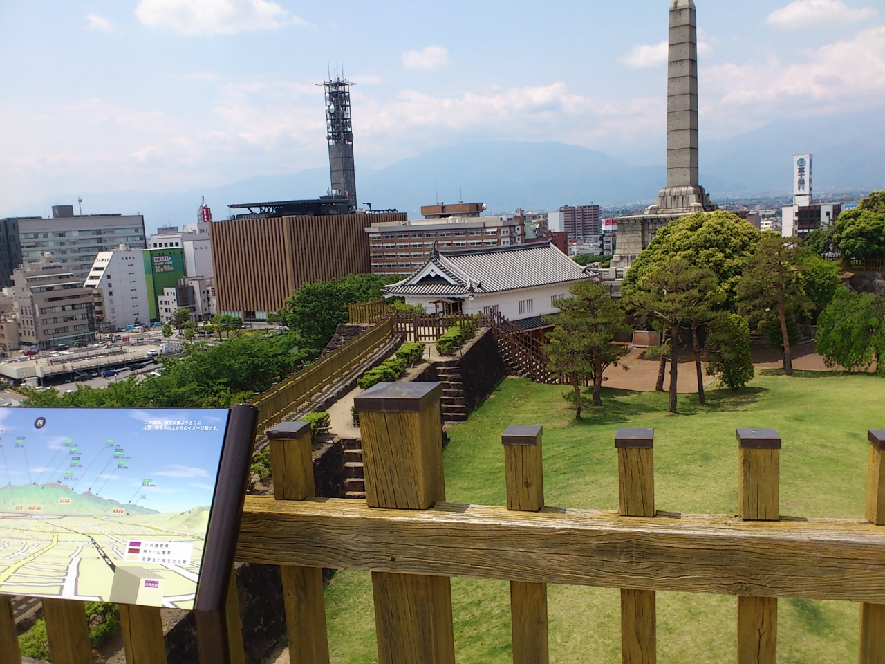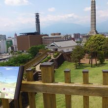 甲府城は豊臣秀吉の命令で作られたお城で武田氏とは関係が薄いお城です。立派な石垣があるお城ですが、建物はほとんど残っていません。お城の一番高い場所に天守台跡がありますが、土台が残るだけで天守閣はありません。天守そのものがなかったという説もあるそうです。ここから甲府市内を一望することができます。
