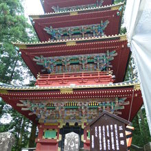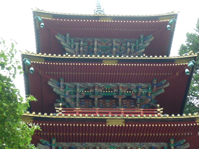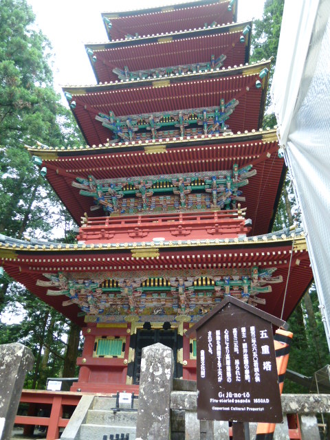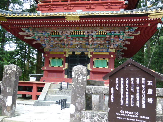 今日は日光東照宮を散策します。まず最初に眼にするのが「五重塔」です。一ノ鳥居の先左手に建っています。1648年の創建でその後焼失1818年再建され、現在高さ35mで5層の造りとなっています。色調は主に朱色ですが、よく見るとここにも豪華な細かな彫刻が施されています。見逃さないでくださいね。