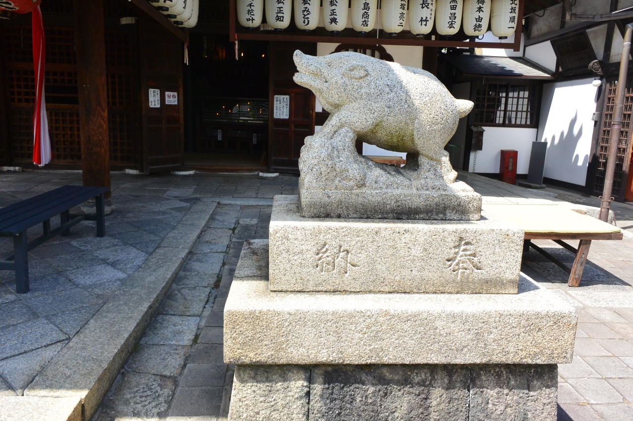 境内には織田信長の父・信秀が再建した摩利支天堂があります。建仁寺の禅居庵の入り口から入ると細い道が通じていますが、大和大路通からのほうが正門のようです。摩利支天が七頭の猪に座す姿から、境内は狛犬も猪、手水舎にも猪と、猪づくしです。