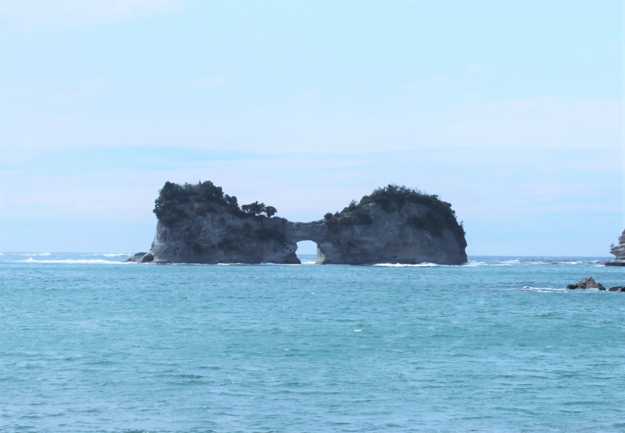 臨海浦の海上に浮かぶ小島で、島の中央に円月形の海蝕洞がぽっかり開いていることからそう呼ばれているそう。