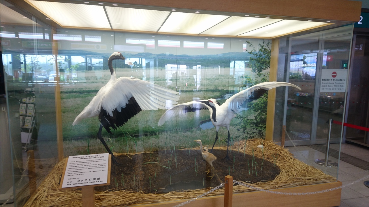 たんちょう釧路空港という名前らしく、1階のロビーには丹頂鶴の剥製が飾られていて、北海道に来たなぁという実感がわきました。