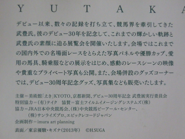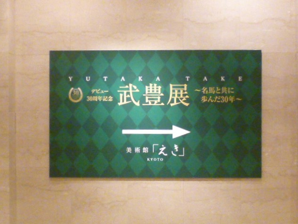 京都駅伊勢丹の7階にある美術館「えき」KYOTOで開催している騎手武豊のデビュー30周年記念「武豊展」に行ってきました。~名馬と共に歩んだ30年~と題し、5月27日から6月12日まで開催しています。展示品は国内外でのレースの写真や優勝カップや盾、勝負服などを展示、またイチローとのサイン入りの写真など幅の広さをうかがえます。また出口後にはTシャツやアクセサリーなど関連商品を販売しています。会場内は写真撮影禁止です。12日まで開催していますので訪問くださいね。有料です。