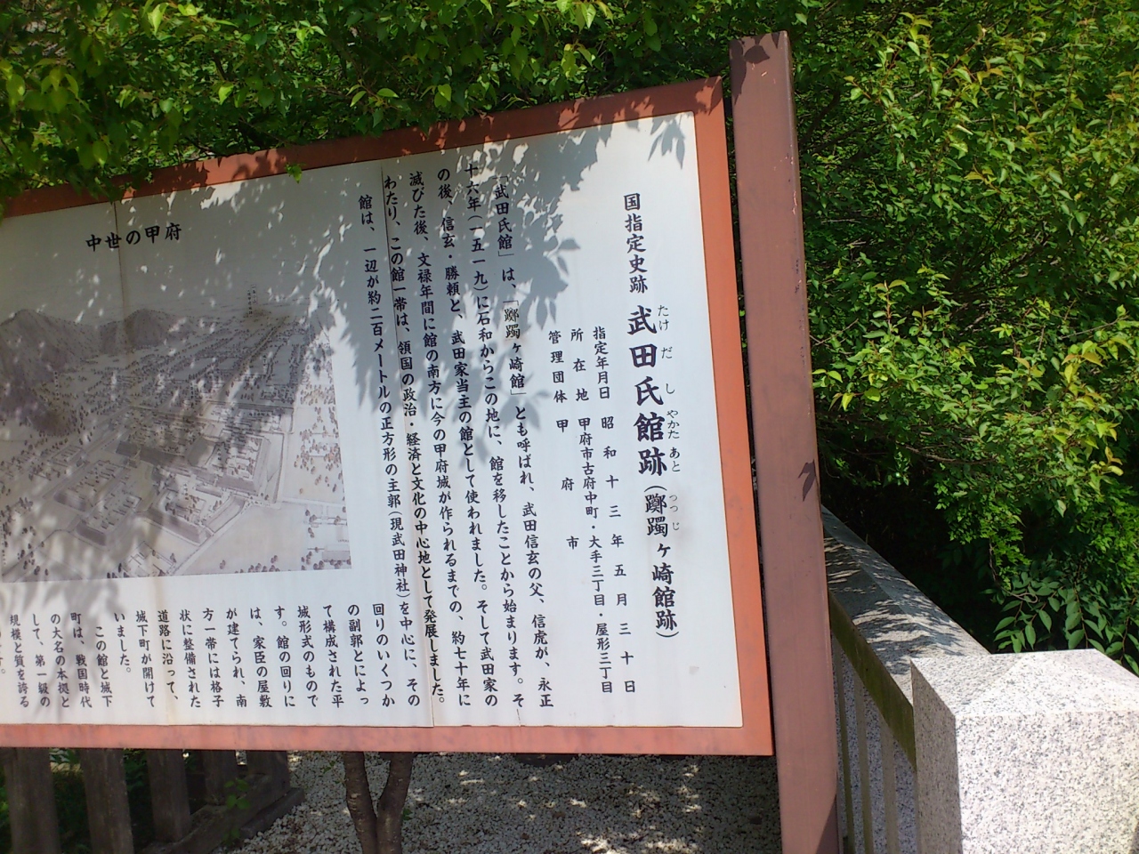 現在は武田神社となっていますが、かつては躑躅ヶ崎館として武田氏3代(信虎、信玄、勝頼)が住んだ館です。武田神社の正門のほうから入ると右側に説明書きの看板しか残っていません。武田氏ほどの大大名ならば大きな天守閣があるお城を想像していましたが、そのようなものもなく、堀があるだけの平坦な場所です。人が石垣という信玄公の言葉通りです。
