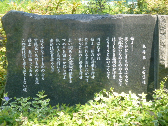 今日は大阪中之島をぶらーとしています。表示板に三好達治さんの歌碑があるとのことなので行ってきました。場所は中央図書館の南側に「緑の賛歌」と言う塔がありますが、その東側で栴檀木橋の下付近の緑地の中にあります。ちょっとわかりにくいですがその気になればわかると思います。三好達治さん?あまり知りませんでした。歌碑のタイトルには「乳母車」、母よ――淡くかなしきもののふるなり紫陽花・・・と書かれています。紫陽花の道を乳母車を押す優しい母の姿が浮かびますね。
