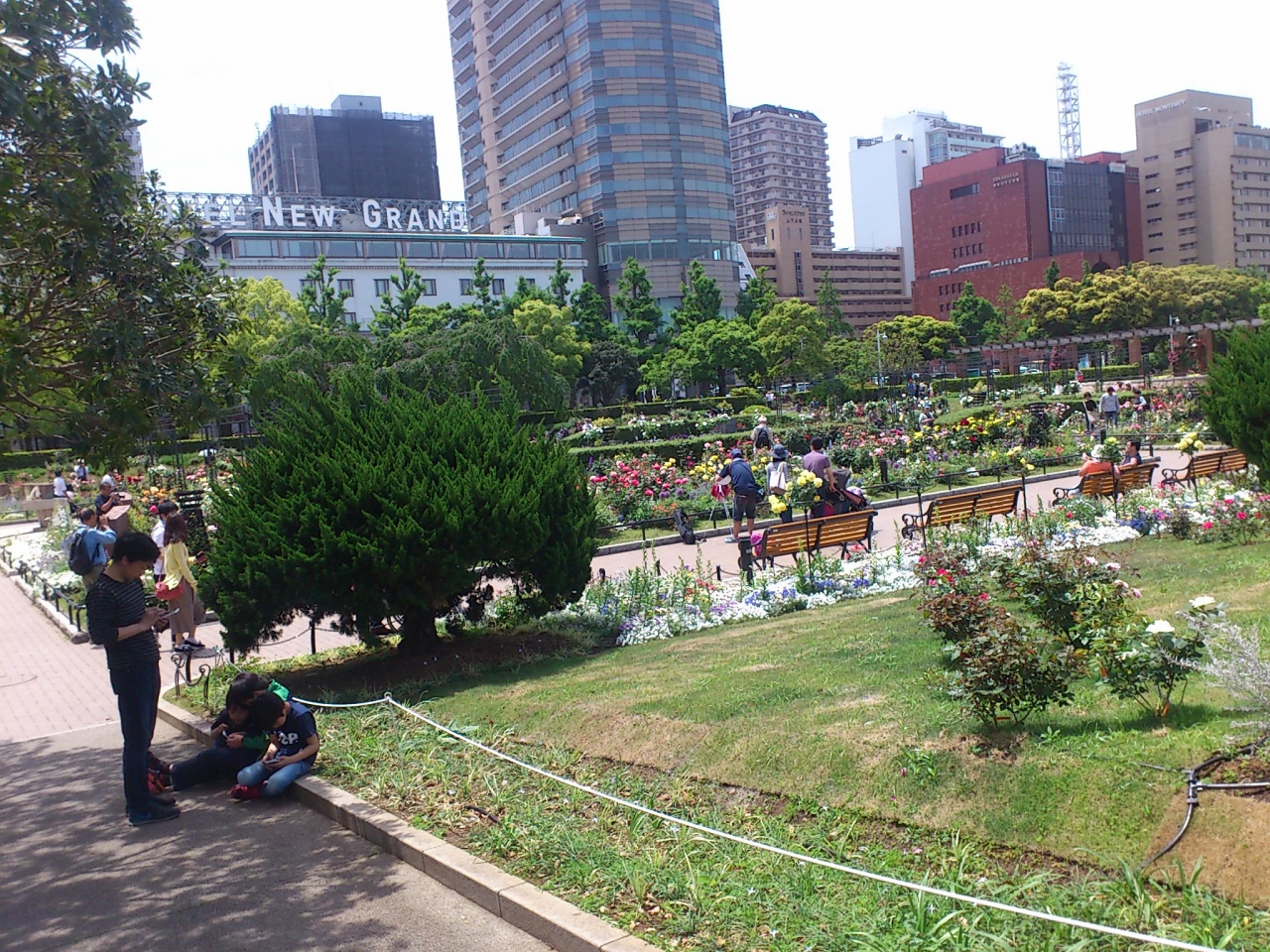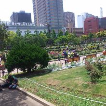 横浜の山下公園の中の南側にある花壇です。近くには氷川丸が係留されています。一段低い位置に花壇があり、このような構造を沈床花壇と言うのだそうです。5月のゴールデンウイーク明けに訪れたのですが、ちょうどバラが咲いていて、とても綺麗でした。