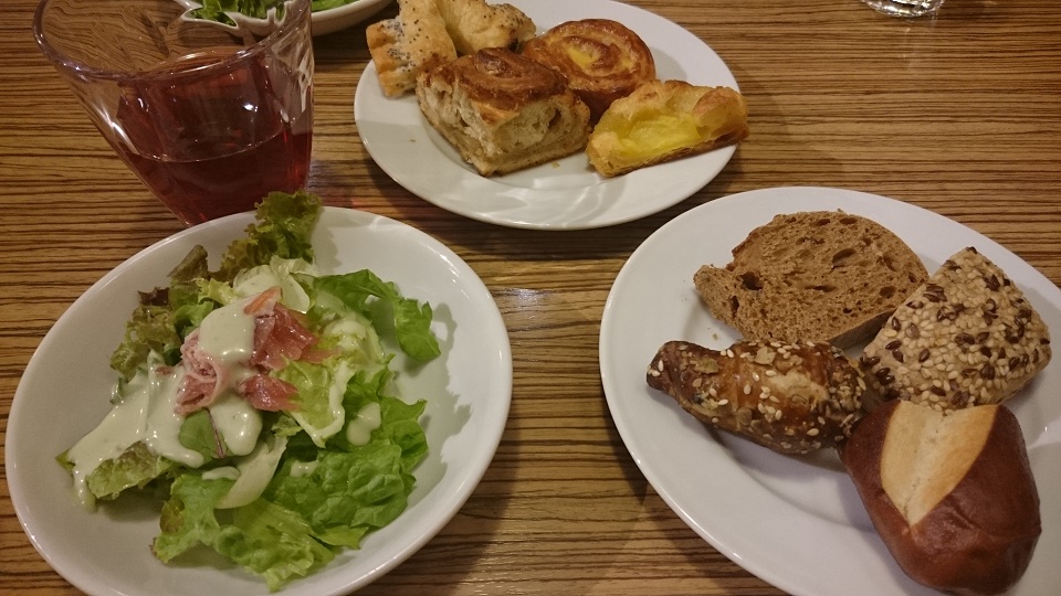 パン食べ放題とドリンクバーの種類は規模は小さいですが、種類も結構あり、楽しめました。パンも1つ1つの大きさが小さめなので、いろんな物を食べることができます。ドイツパンのようなハード系のものや定番のクロワッサン、カスタードクリーム入りのデザート系のパンとバラエティに富んでいました。