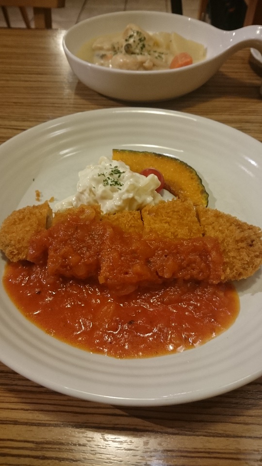 私は「マグロカツ」、夫は「チキンとキノコのクリーム煮」を注文。カツと言っても油っぽさや重たい感じが全くなく、美味しかったです。