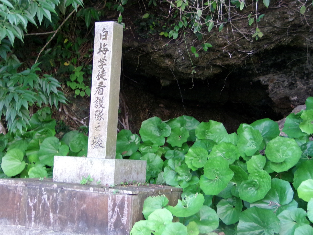 八重瀬町富盛の八重瀬公園駐車場付近に?白梅学徒看護隊之壕?という石碑がひっそりと建立されています。沖縄での地上戦が始まる少し前に沖縄県立第二高等女学校4年生の生徒から構成された?白梅学徒看護隊?55名が第24師団第一野戦病院第4・5班に配属されました。戦況の悪化で新城分院(ヌヌマチガマ)が開設され、学徒隊5名が転属となりますがその後6月には分院付近が戦場となり、分院は閉鎖を余儀なくされ5名は原隊に戻ります。