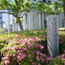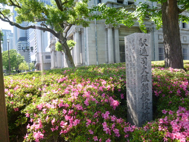 今日は大阪中之島を散策しています。その中にはレトロな建物や史跡が残っています。日銀大阪支店前にある「駅逓司大阪郵便役所跡」もそのひとつです。今は誰でも利用する郵便はいつ頃からできたのでしょうか、江戸時代は馬や飛脚でしたよね。はじまりは明治4年、東京から大阪間で郵便業務が開始され、大阪側は島原藩蔵屋敷があったこの場所に役所が置かれポストもあったようです。その記念碑なのですね。横には「郵便は世界を結ぶ」ポストが設置されています。合わせてご覧なってくださいね。