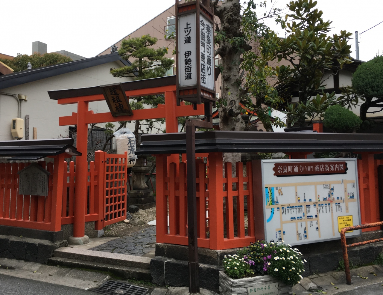 ならまちの路地裏、住宅街の中にありました。朱塗りの鳥居が目を惹く小さな神社です。境内にある巨石は賽の神(さいのかみ)で、勝者の守護神として篤い信仰をあつめており、博打の神さんとも呼ばれ親しまれているそうです。