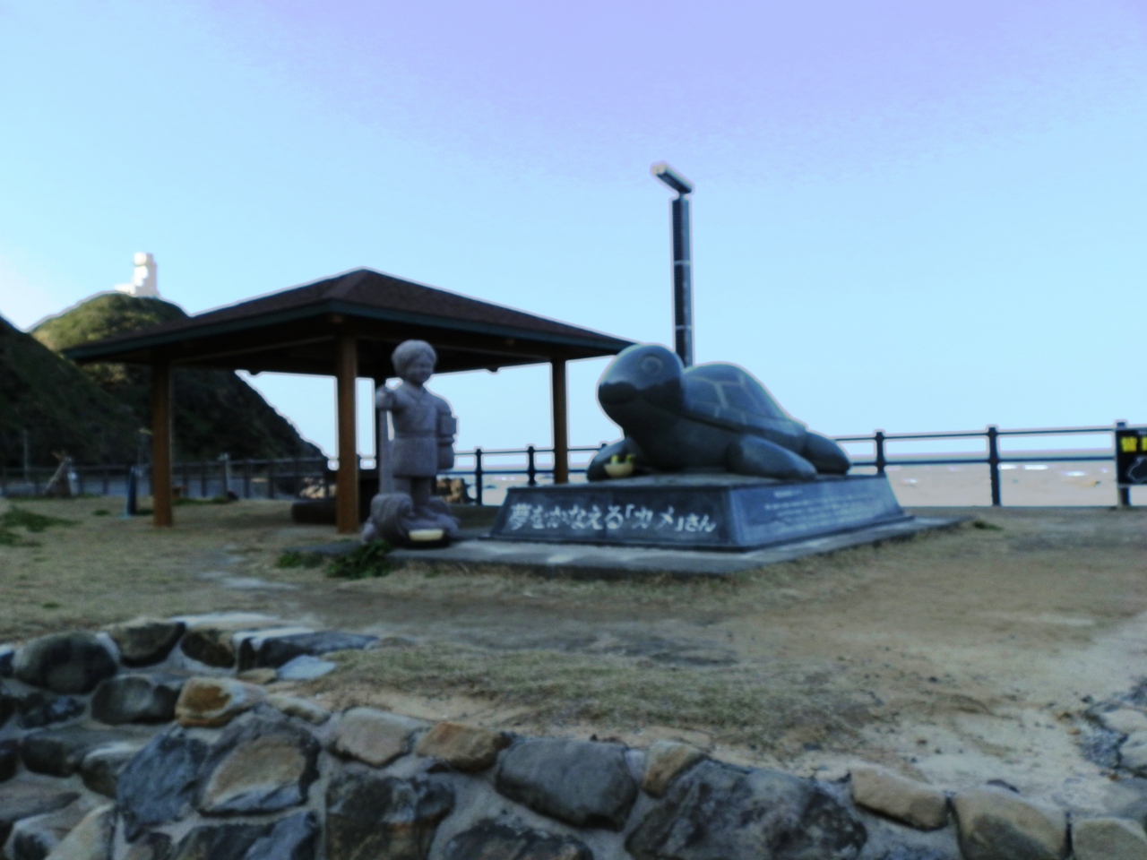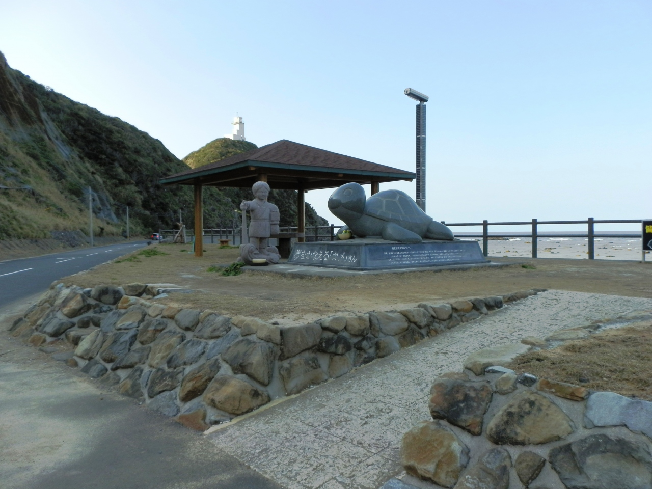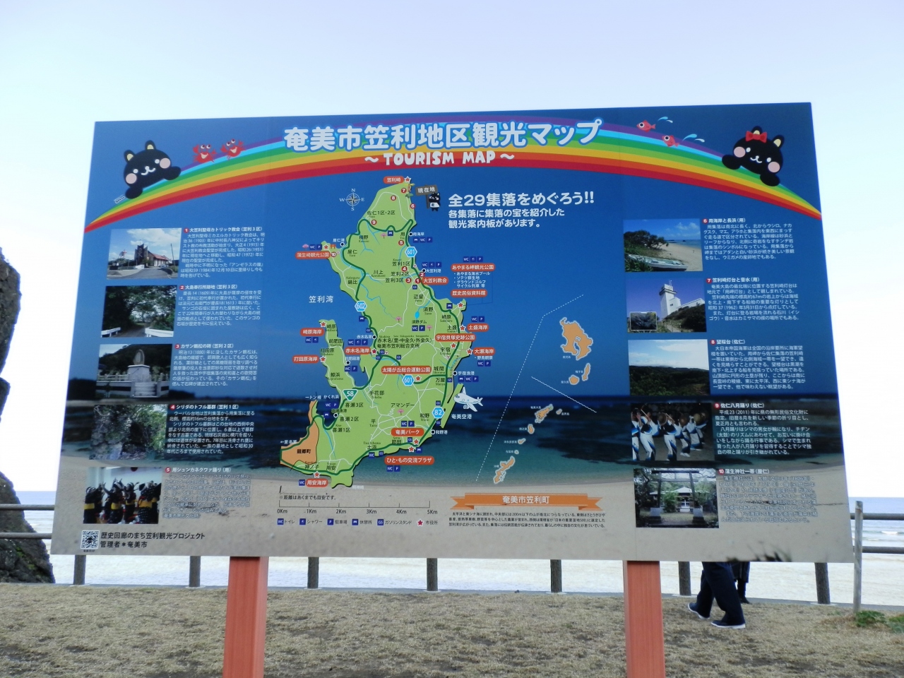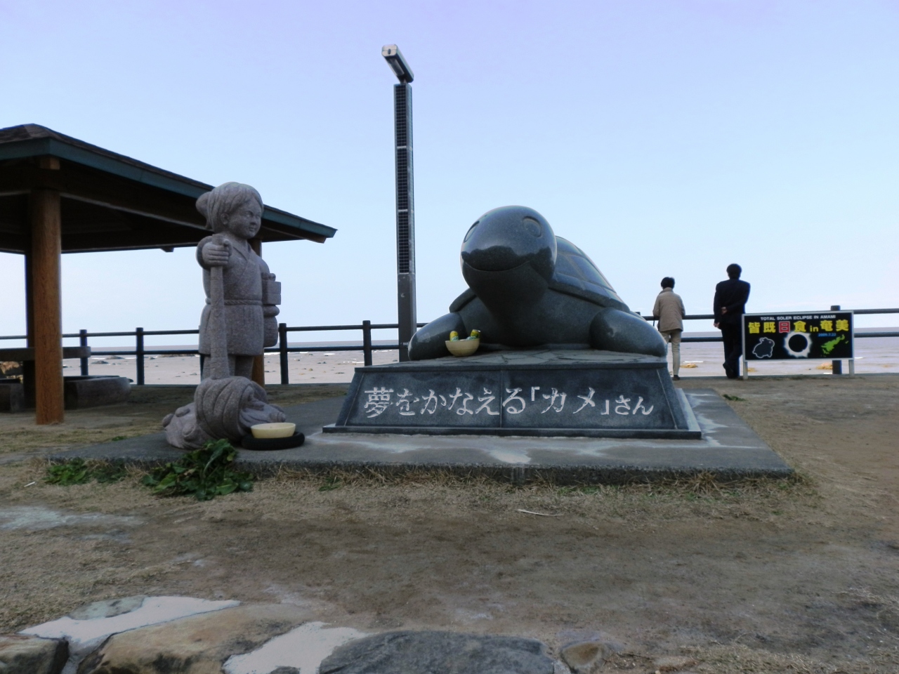 カメが登場して、小高い丘の上に灯台が見えて来ます。笠利崎灯台には登ることができ、下から10分もかかりません。登ると海からの風が吹き抜け、心地良かった。