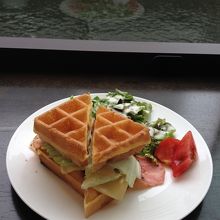 パンの代わりにワッフルで野菜やベーコンをはさんでいるBLTを注文。