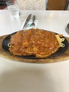 スパカツはアツアツの鉄板でジュージューいいながらきます。