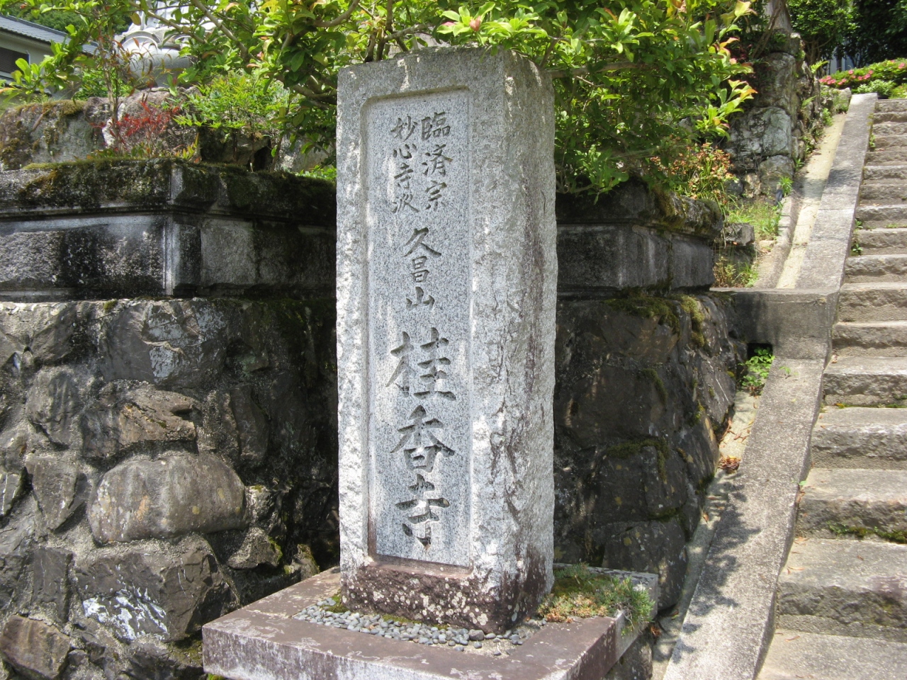 高槻市立樫田小学校の北側、府道733号線沿いに“桂香寺”の標識があり、その横から細い間道を上がると「桂香寺」の石標があり、石標横の石段を上ると境内に至ります。