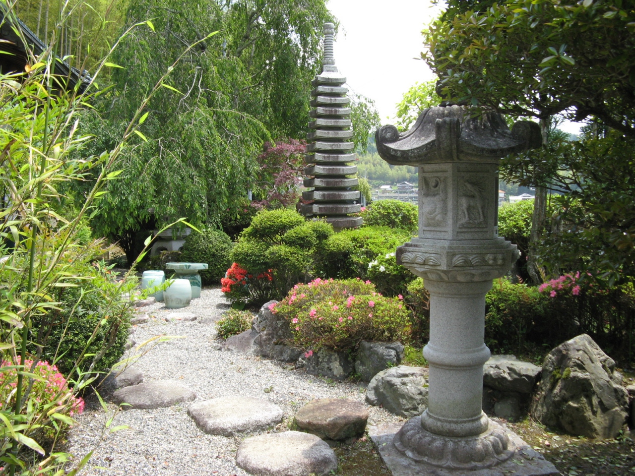 お寺は立派な石垣の上、少し高台にあって、立派な石塔や灯篭が並ぶきれいに整備された境内から、集落を見渡すことができます。