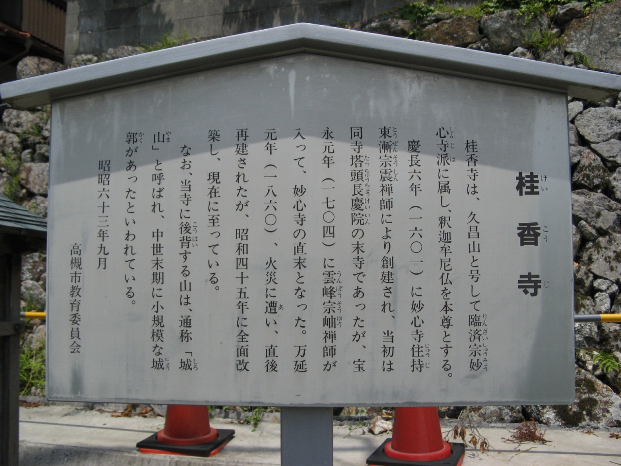 現地にあった由緒書きによると、『桂香寺は、久昌山と号して臨済宗妙心寺派に属し、釈迦牟尼仏を本尊とする。慶長6年(1601年)創建された。万延元年(1860年)火災に遭い、その直後再建されたが、昭和45年に全面改築され現在に至る』とあります。詳細は由緒書きの写真を添付しますので参照ください。