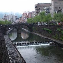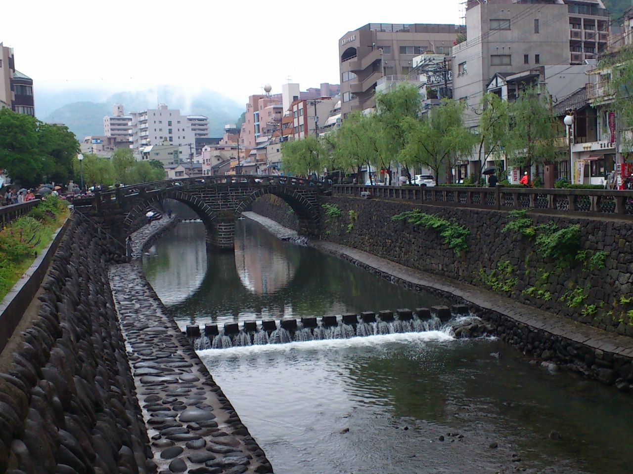 長崎の有名な観光地のうちの一つです。中島川にはたくさんの橋が架かっていて、そのうちの一つですが、川面にメガネのように映えるその姿はやはり見応えがあります。訪れたのが5月の末だったので、丁度、ながさき紫陽花(おたくさ)まつりをやっていて、この橋の周りに綺麗にアジサイが咲いていて、とても素敵でした。