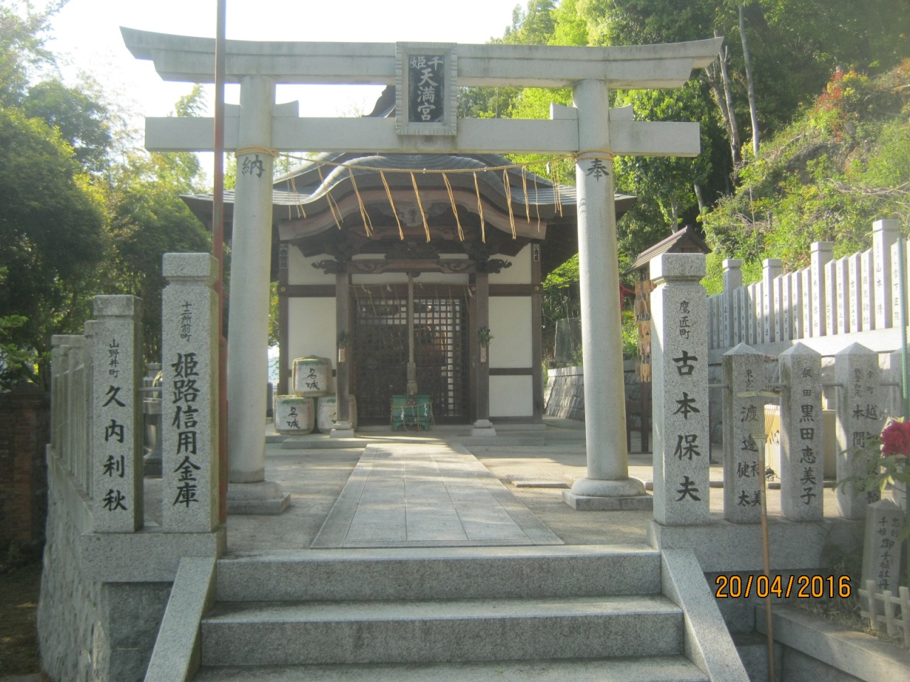 姫路城からは西にある男山の中に建てられています。傾斜地にある小さな神社です。千姫が酒井氏の繁栄を祈願して建てたようです。天満宮ですので雄牛の像もあります。またこの神社に徳川義宣も参拝したという碑がたっています。
