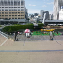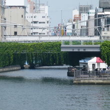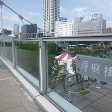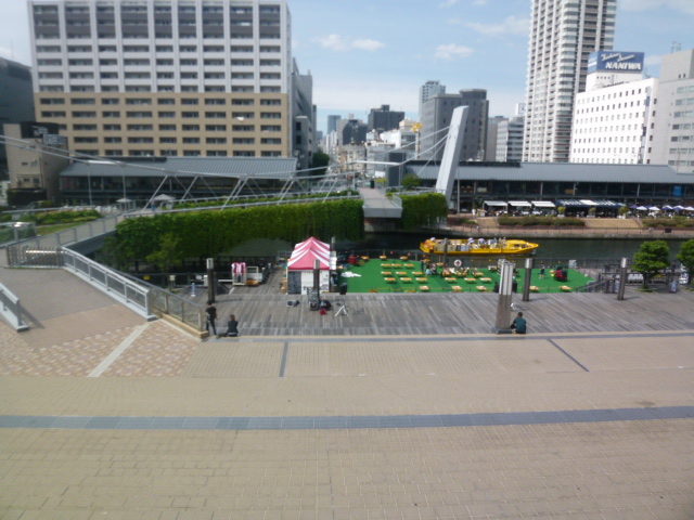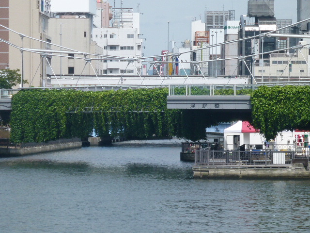 道頓堀川沿いを道頓堀橋から西へ散策しています。すると緑に包まれた橋があります、これが「浮庭橋」です、さらには真っ直ぐな橋ではなく、何ヶ所か、くの字になっています。面白いですね。時にはイベントが開催されるのでしょうか、ちょっとした会場もありますね。また遊覧船のUターン場所にもなっているようです。落ち着ける場所です立ち寄ってくださいね。