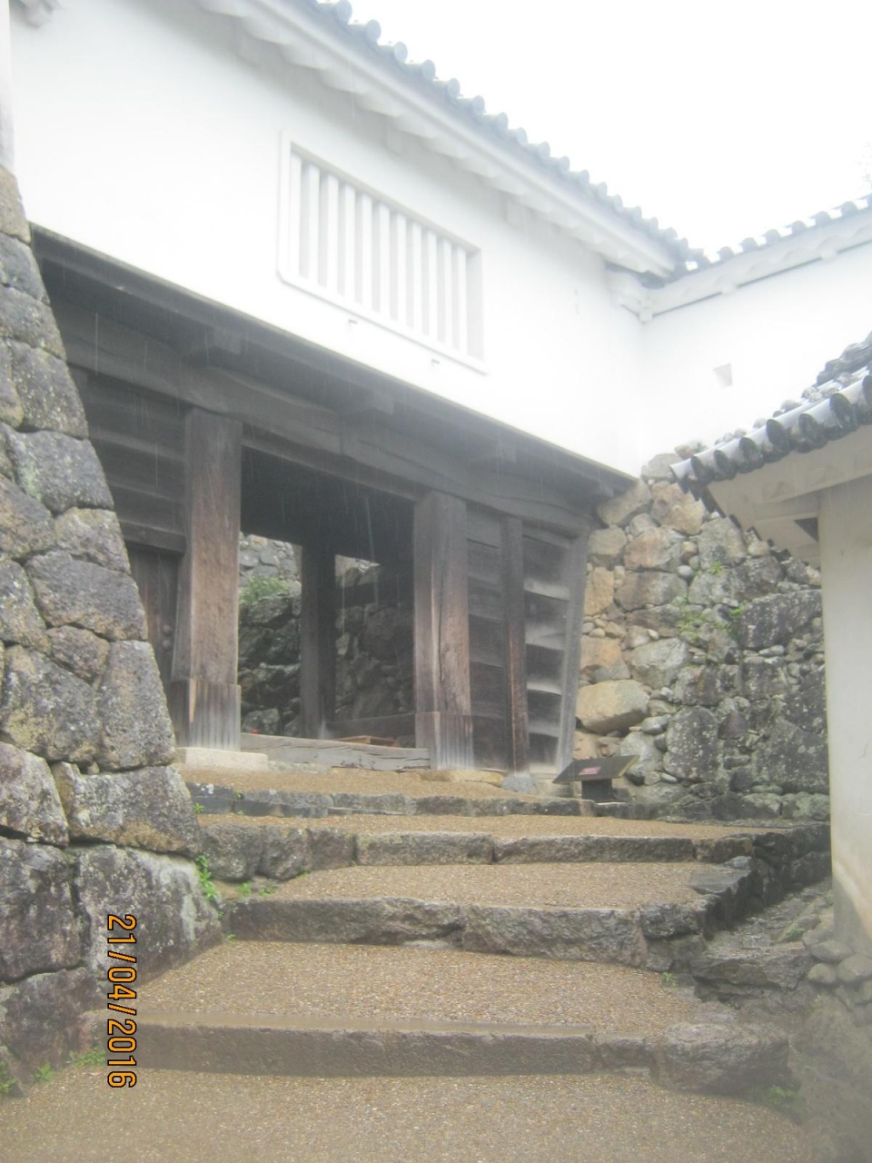 本丸天守閣に行くためには菱の門から「いの門」そして「ろの門」をくぐり「はの門」になります。この門は両側に土塀があり狭い石段をのぼると門が現れます。防衛上も重要な位置です。姫路城ではこの門は何度も出てきています。