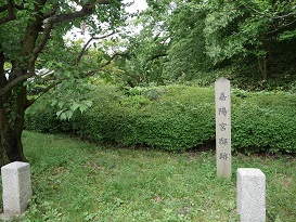 京都御苑の西側には6か所の門が有りますが、その一つで出水門を入ると直ぐの右側に小高い丘が有ります。ここに「嘉陽宮邸跡」の石碑が立てられています。元々は女院の御所であった所の一部を嘉陽宮家が居宅として使用していた場所で建物は無く石碑のみです。