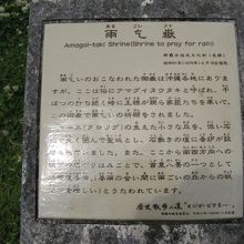 御嶽の説明板によると『雨乞いのおこなわれた御嶽(ウタキ)は沖縄各地にありますが、ここは俗にアマグイヌウタキと呼ばれ、干ばつの打ち続くときに、王様が親(みずか)ら家臣たちを率いて、この御嶽で雨乞いの祈願をされました。 マーニ(クロツグ)の生えた小さな丘を、低い石垣で丸く囲んで聖域とし、石敷きの壇に香炉が設けられていました。