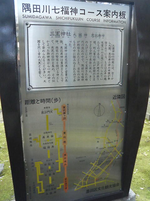 東武線・堀切駅近くの多聞寺から都営地下鉄・本所吾妻橋駅近くの三囲神社まで、隅田川に沿った本所や向島周辺の寺社に七福神が点在しています。