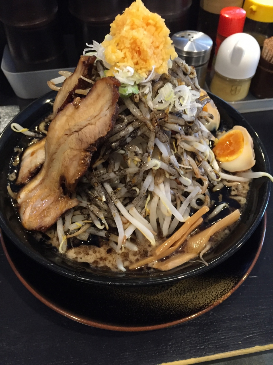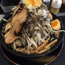 二郎系のラーメンのようなモヤシの盛りに、見た事ないマー油の掛かったディテールです。