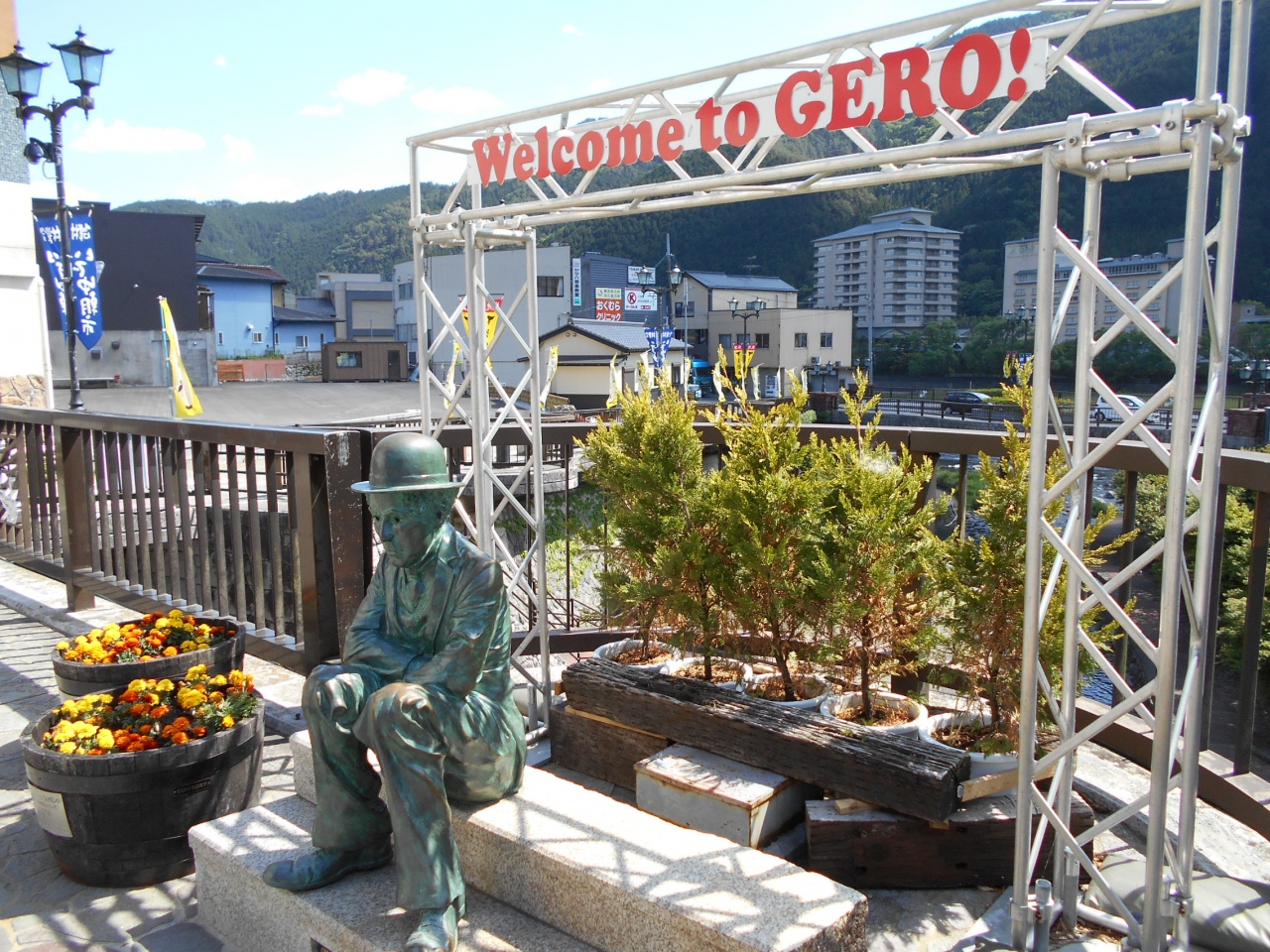 町の真ん中の目立つところ(橋の上です)にチャップリンの座った像があります。上には下呂温泉へようこその文字が。それを見るだけではどうしてチャップリンと下呂温泉が関係があるのかよくわからないのですが、とりあえず写真スポットです。