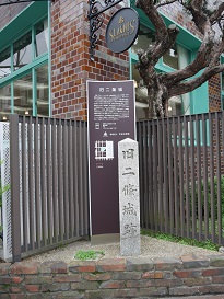 聖アグネス教会の脇(下立売通)と室町通の交差する角に「旧二條城跡」の石碑が建てられています。永禄12年織田信長によって室町幕府15代将軍、足利義昭の将軍座所として建てられたそうです。石碑を中心に400m四方の大きな城だったそうですが天正4年に取り壊され現在は石碑と二条城内に当時の石垣の一部が残されているだけです。