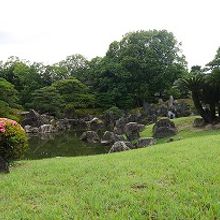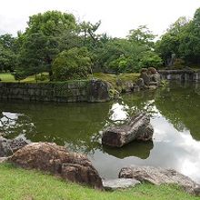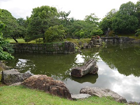 二条城唐門を潜り、正面が二の丸御殿で左方向に行くと二の丸庭園が有ります。この庭園は小堀遠州作と伝えられており古くからの造園術に従い基本的な造りになっていて池の中央には蓬莱島を配置し左右には鶴亀の島を置く書院造庭園です。