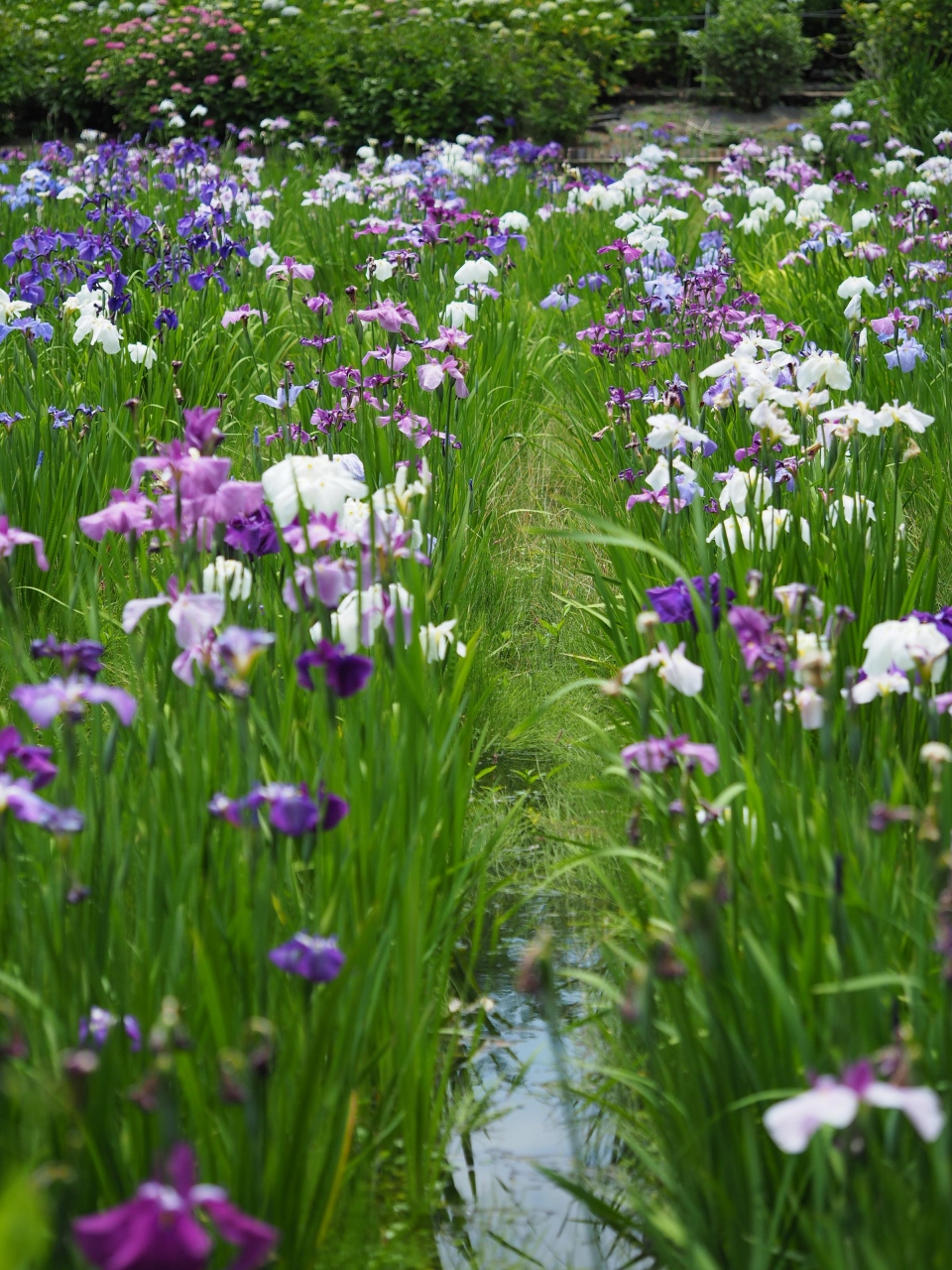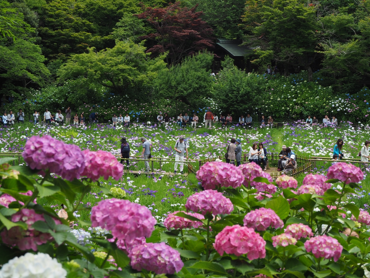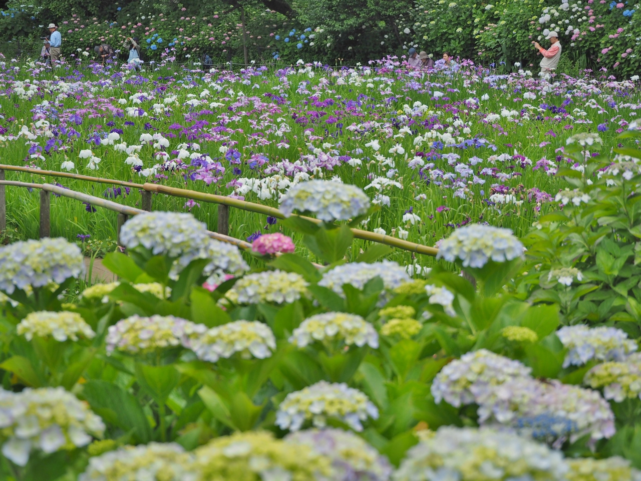 あじさい寺として知られる本土寺。境内は見渡す限りあじさいがひろがり頭上を覆う新緑と新鮮なあじさいがキラキラと輝いて見えます。2016.6.8現在花菖蒲はピークを若干過ぎたもののまだまだ見応えあり後1~2日は見ごろの始まったあじさいとのコラボが見られそうです。