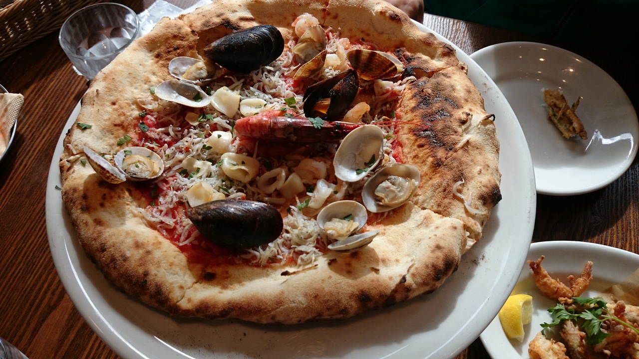 また、ムール貝、アサリ、イカ、エビなど具沢山で汁だくのシーフードのピザがメニューに有ります。