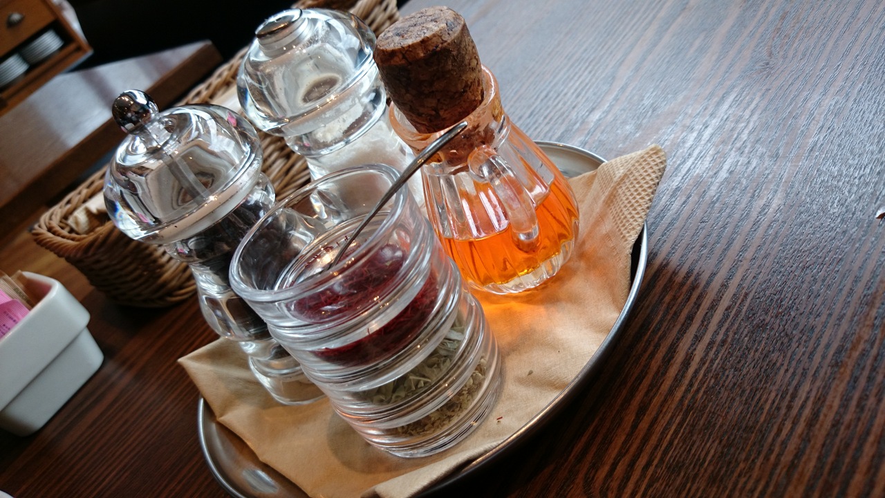 またテーブルには唐辛子のオリーブオイル、バジル等の薬味も置いてあり凝ってます。