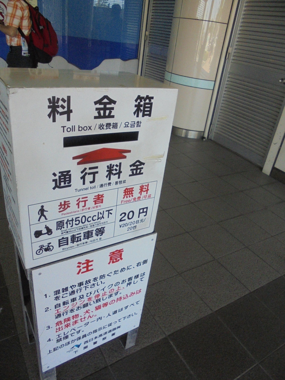 下関からかいり、門司に向かいました。780メートルで15分あるきました。意外と涼しくて快適に歩くことができました。山口県と福岡県の県境で記念写真も撮りました。海底旅行した気分です。無料で通行できますが、出口付近はなにもなく近くのバス停から門司へ行きました