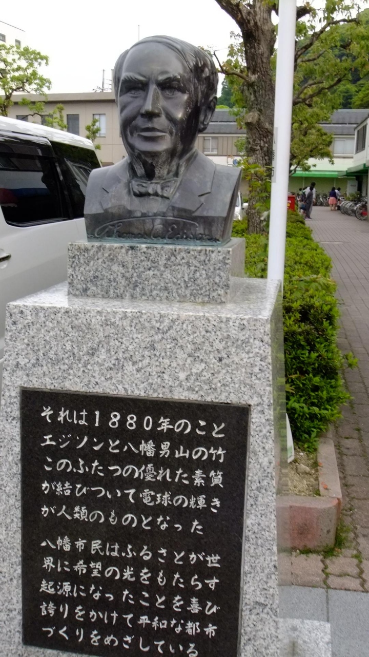 男山や石清水八幡宮を参拝しながら八幡見学をしました。八幡は駅前から「エジソン」関連の通りや物がたくさんありました。調べたところ、エジソンはここの八幡の竹を使ってフィラメントを作った模様。なので町全体でエジソンをたたえているのですね。