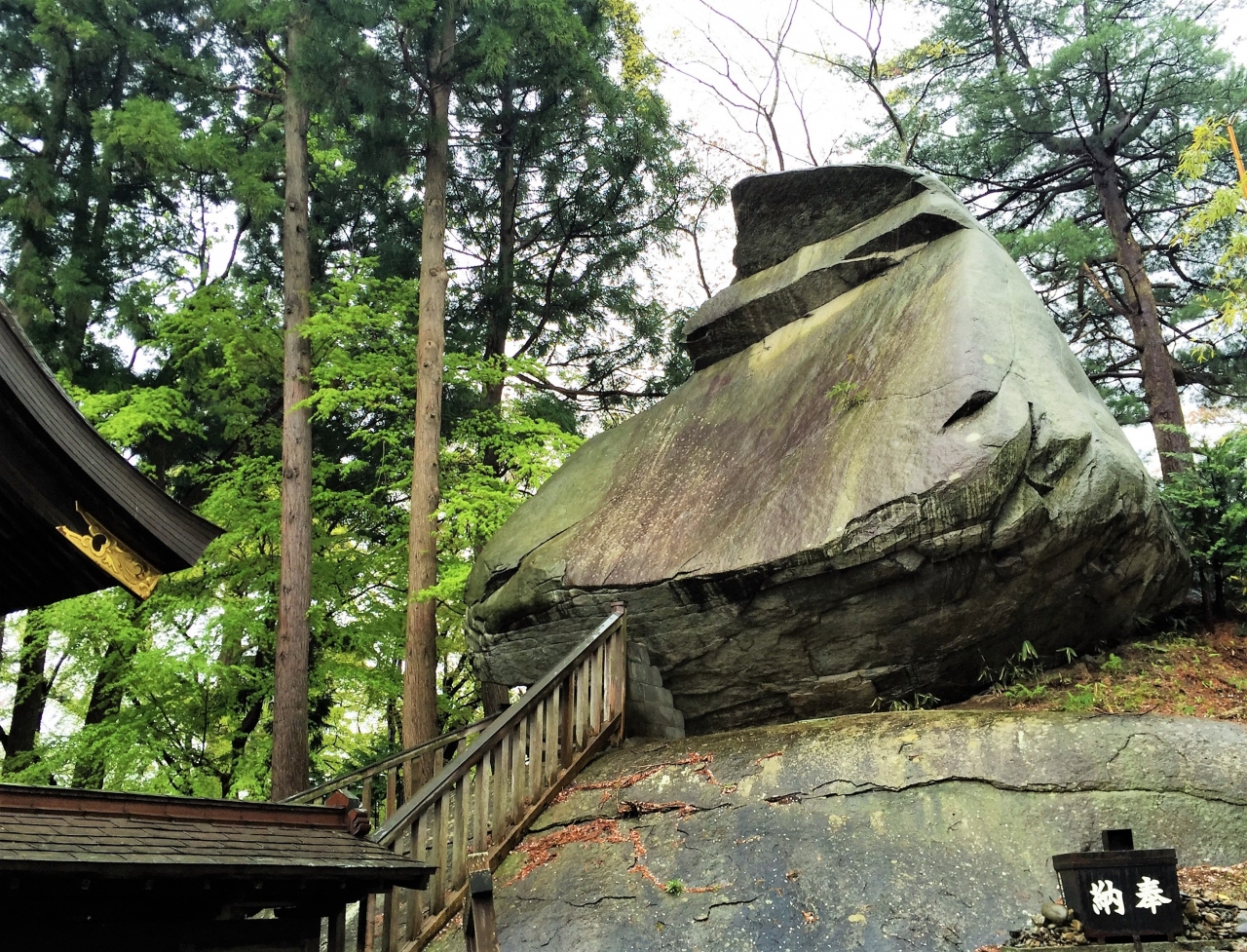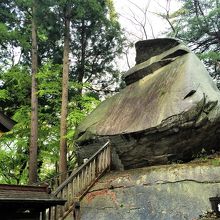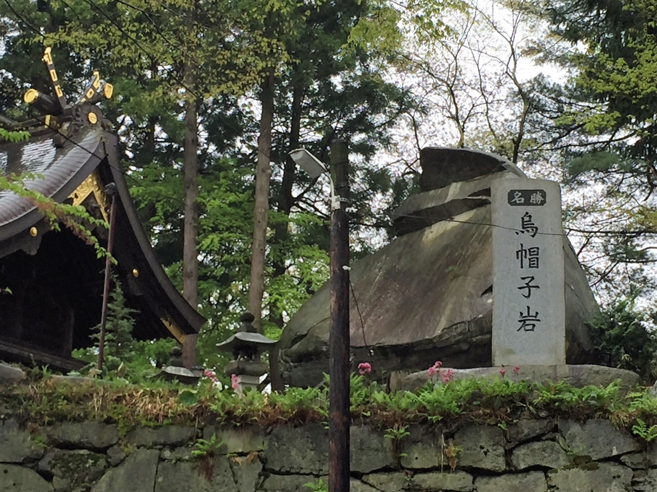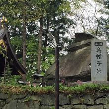 桜山神社本殿背後には巨大な奇岩「烏帽子岩」が鎮座します。