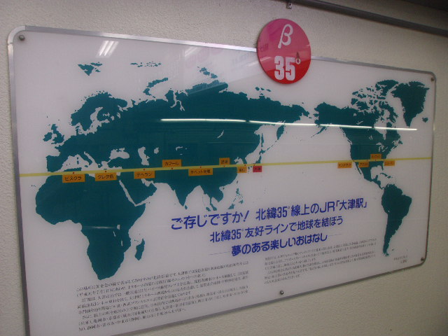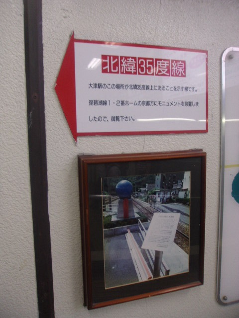 JR大津駅は北緯35度線が通過していることで知られていて、それを記念して設置されたのがこのモニュメントです。ホーム上に設置されていますので、有効な乗車券や入場券がないと見ることが出来ませんが、鉄道旅の途上などで立ち寄ると、世界の中の大津の地理的な位置が実感できて、とても旅情がそそられて良いかと思います。