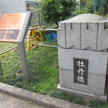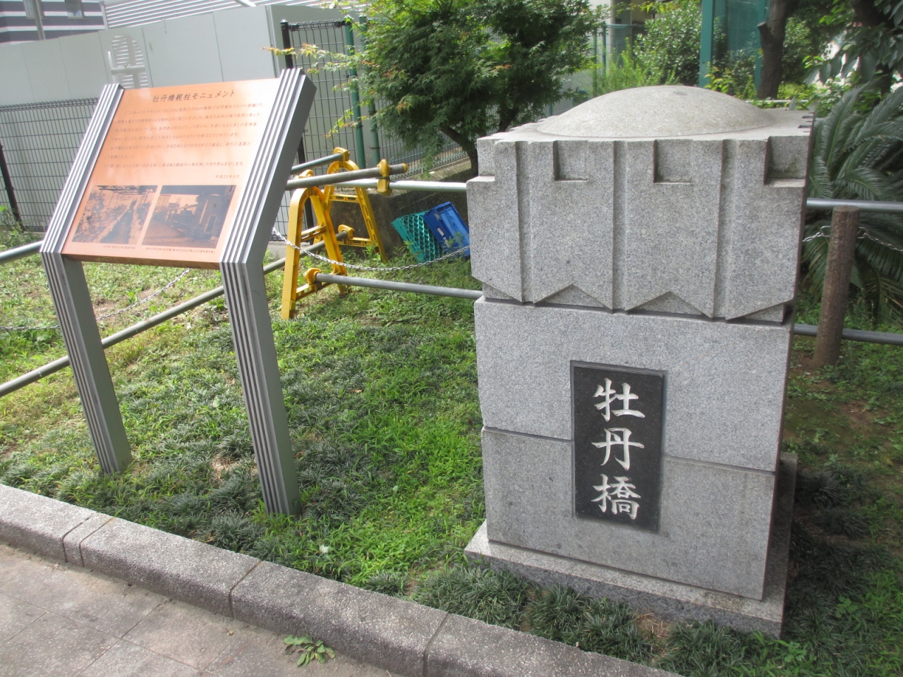 錦糸町南口を出て京葉道路を超えて、丸井を正面に見て丸井の右側の道を南に下って行くと、高速道路の下のところに橋名板のついた親柱のモニュメントと説明板があります。牡丹橋は竪川埋め立てにより平成2年に撤去されたそうです。せっかくのモニュメントなのですが高速道路の下にあるせいか周辺の雰囲気がちょっと荒んだ感じなのが残念でした。