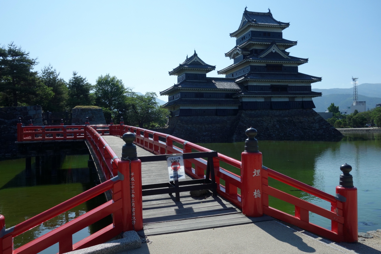 松本城の堀に架かる木造の橋です。「まいばし」ではなく「うずみのはし」と読むようです。黒い松本城と赤い橋の取り合わせがフォトジェニックに映えます。残念ながら通行できないようになっていましたが、いつもそうなのでしょうか。