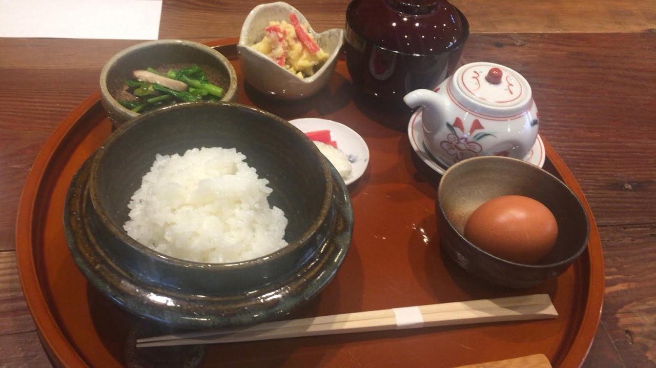 朝はメニューが少ないですが、卵かけごはんにおかずが少しと