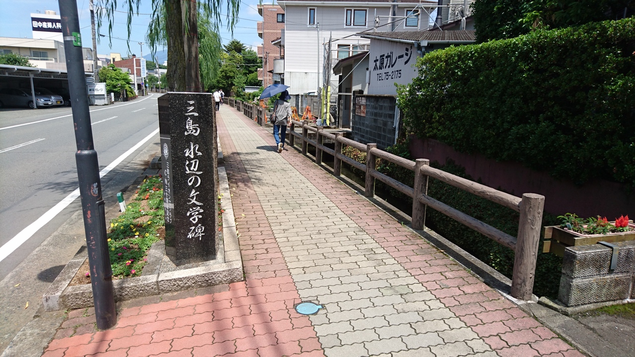三嶋大社から白滝公園に向かう道沿いに色々な作家の文学碑がたっています。井上靖や司馬遼太郎などの有名作家が、三島市のことについて記した文章が石に刻まれています。。