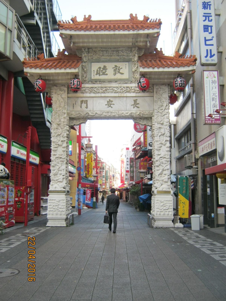 南京街は東西南北に門があります。今は北には門はないです。東にあるのが長安門です。中国の建築で長安門と彫られています。石柱には文様風の作りです。この門の脇には布袋尊のような石像がありました。門をくぐると中華の飲食店が並んでいます。