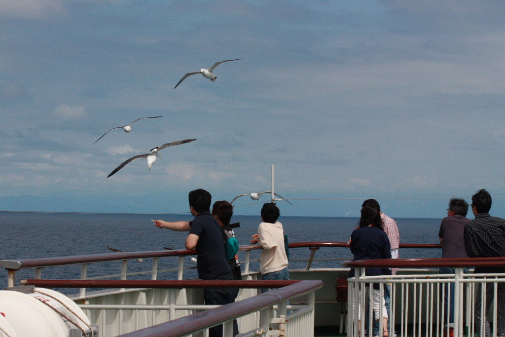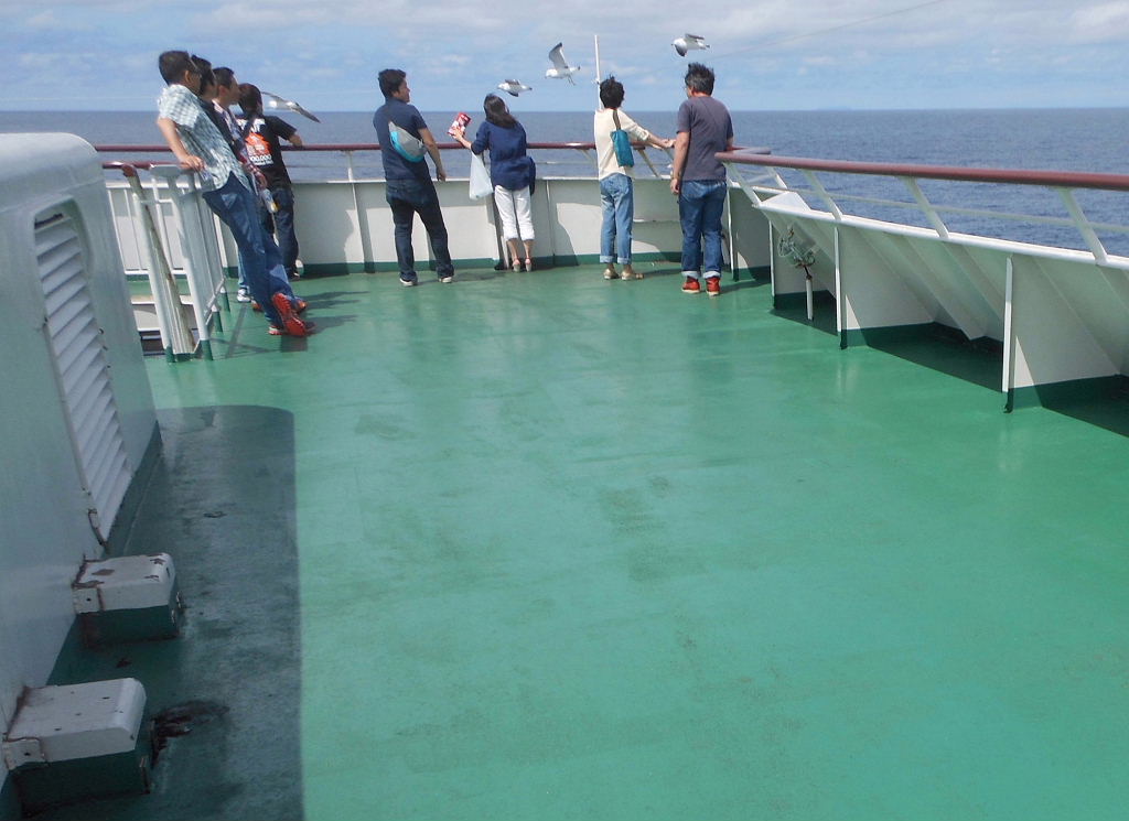 船内では、後部甲板でウミネコへの餌やりを見たり、風景を楽しみました。海風に当たって少し疲れたので、二等船室に降りて横になってくつろぎました。新潟港に着くまで、狭い観光バスに何時間も乗っていたので、横になってくつろぐ事ができ、とても良かったです。