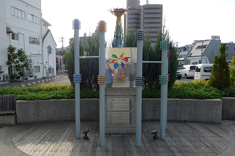善光寺の参道沿いにある長野冬季オリンピックの記念施設です。オリンピック表彰式会場として使用したセントラル・スクゥエアの五輪マーク、聖火台オブジェを移設し、展示されています。僕は二年間長野市に住んでいましたが、その間一度も存在に気づきませんでした。民間駐車場と隣接しているのですが、場所があまり良くないのかも。