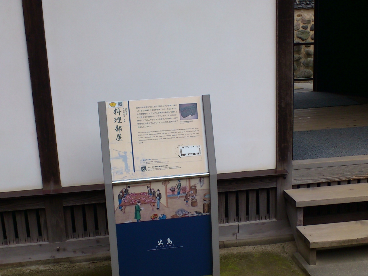長崎の出島の中にある建物です。商館長の住まいのカピタン部屋の裏の方に、乙名部屋とこの料理部屋の2つの建物があります。出島のメイン通りに面していないので、観光客はほとんどいません。商館員たちは1日2回、近くのカピタン部屋の2階で食事をしていました。その食事を作っていたところが料理部屋だそうです。そんなに大きな建物ではありませんが、中では当時の様子が再現されています。カピタン部屋の2階は是非見た方が良いと思います。