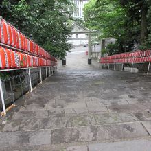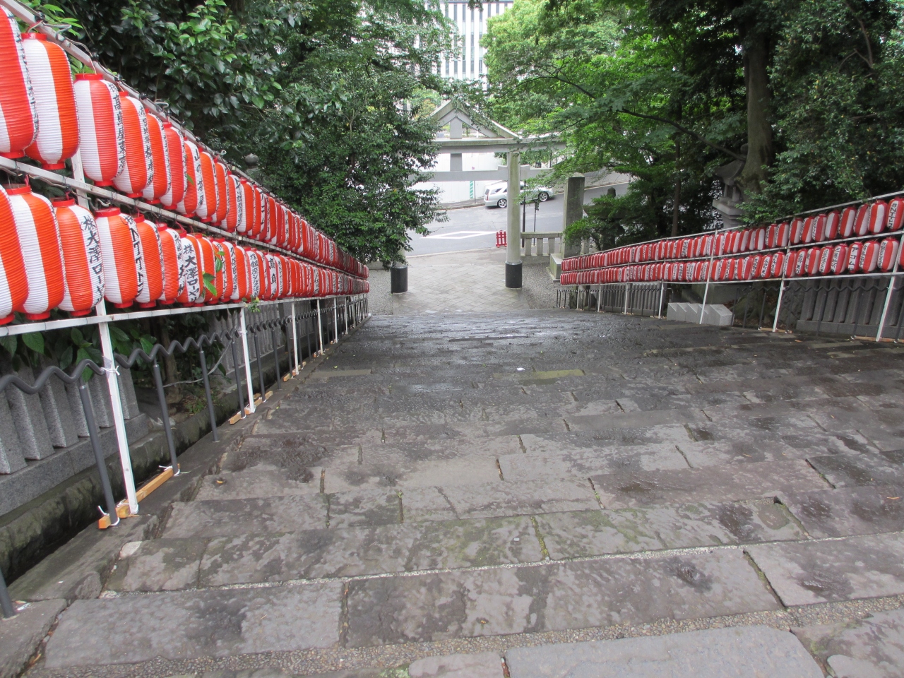 日枝神社拝殿に向かう53段の急な階段です。神幸祭の次の日に行われる上町連合宮入では、足元が見えない中、この階段を神輿を担いだままで上っていきます。しかも神輿は傾け、肩に担ぎ棒を食い込ませたままで上ります。祭り当日はとても混み合うので、祭りの1週間前に参拝に行ってきました。普通に上るだけでも大変なのに、神輿を担いだままで上る姿は圧巻に違いありません。