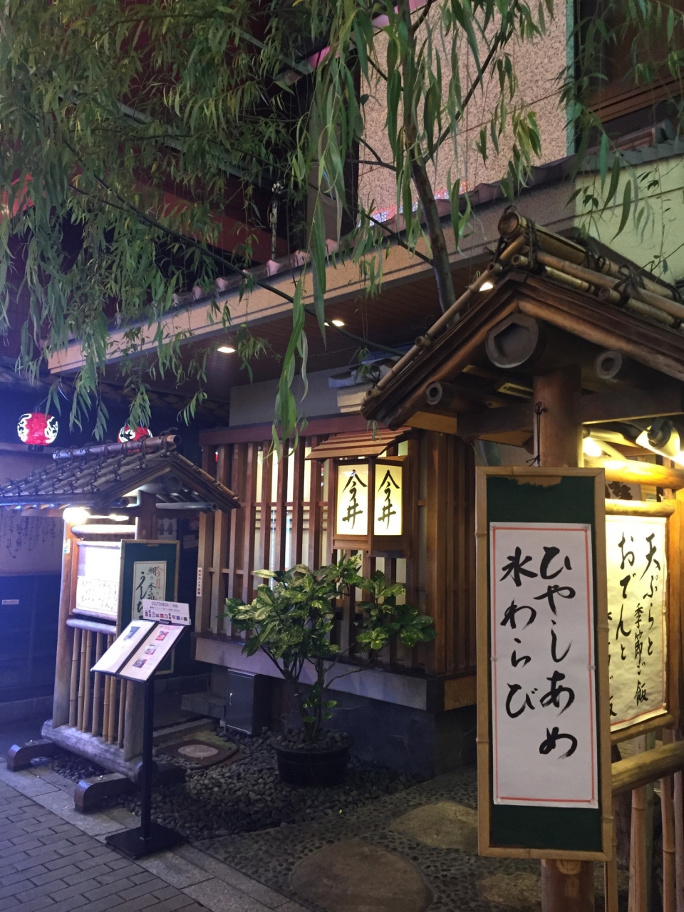 コテコテの看板の道頓堀の真ん中あたりに風情がある柳の木がお出迎え