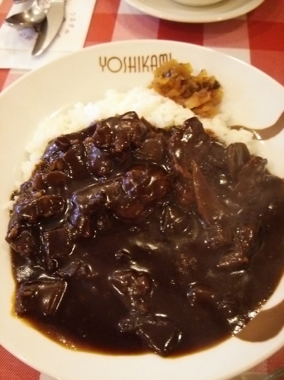 人気らしいハヤシライスは焦げるまで煮込みました感の、じっくり濃い味で野菜も牛肉もタップリ!
